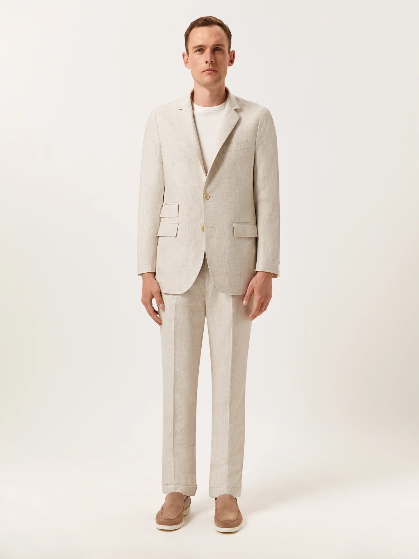 Fazendo parte da coleção Wedding Capsule, este fato slim de duas peças é o epítome da elegância refinada, combinando sofisticação e conforto para ocasiões em climas quentes. Feito com mestria em tecido 100% linho, em tons suaves e claros com um subtil padrão xadrez Príncipe de Gales, este fato oferece uma sensação fresca e leve, perfeita para os meses mais quentes. O blazer apresenta dois botões na frente, lapelas de entalhe, bolsos de debrum com palas, e um bolso adicional para tickets, acrescentando praticidade e estilo. Sem forro, garante a máxima frescura e um fit descontraído, sendo ideal para os dias agitados de verão. As mangas com quatro botões e as duas aberturas atrás permitem facilidade de movimento, enquanto os bolsos da frente e interiores foram cuidadosamente concebidos e oferecem um armazenamento funcional com um acabamento limpo e polido. As calças foram desenhadas com a elegância em mente, apresentando pregas na frente para um look elegante e sofisticado, e bainha dobrada para um look elegante e feito à medida. Vêm com fecho na braguilha, cós alongado com botões e dois bolsos laterais com um discreto bolso para moedas. Dois bolsos traseiros embutidos e passadores para o cinto proporcionam uma versatilidade adicional, fazendo destas calças o complemento perfeito para o fato. Este fato combina na perfeição a alfaiataria clássica com a praticidade moderna, sendo a escolha perfeita para qualquer ocasião em que o conforto e o estilo são essenciais. Seja para participar num evento de verão ou para desfrutar de uma noite sofisticada, este fato irá acompanhá-lo facilmente durante o dia. Todos os fatos têm medidas de regular do tamanho 56 ao 62.