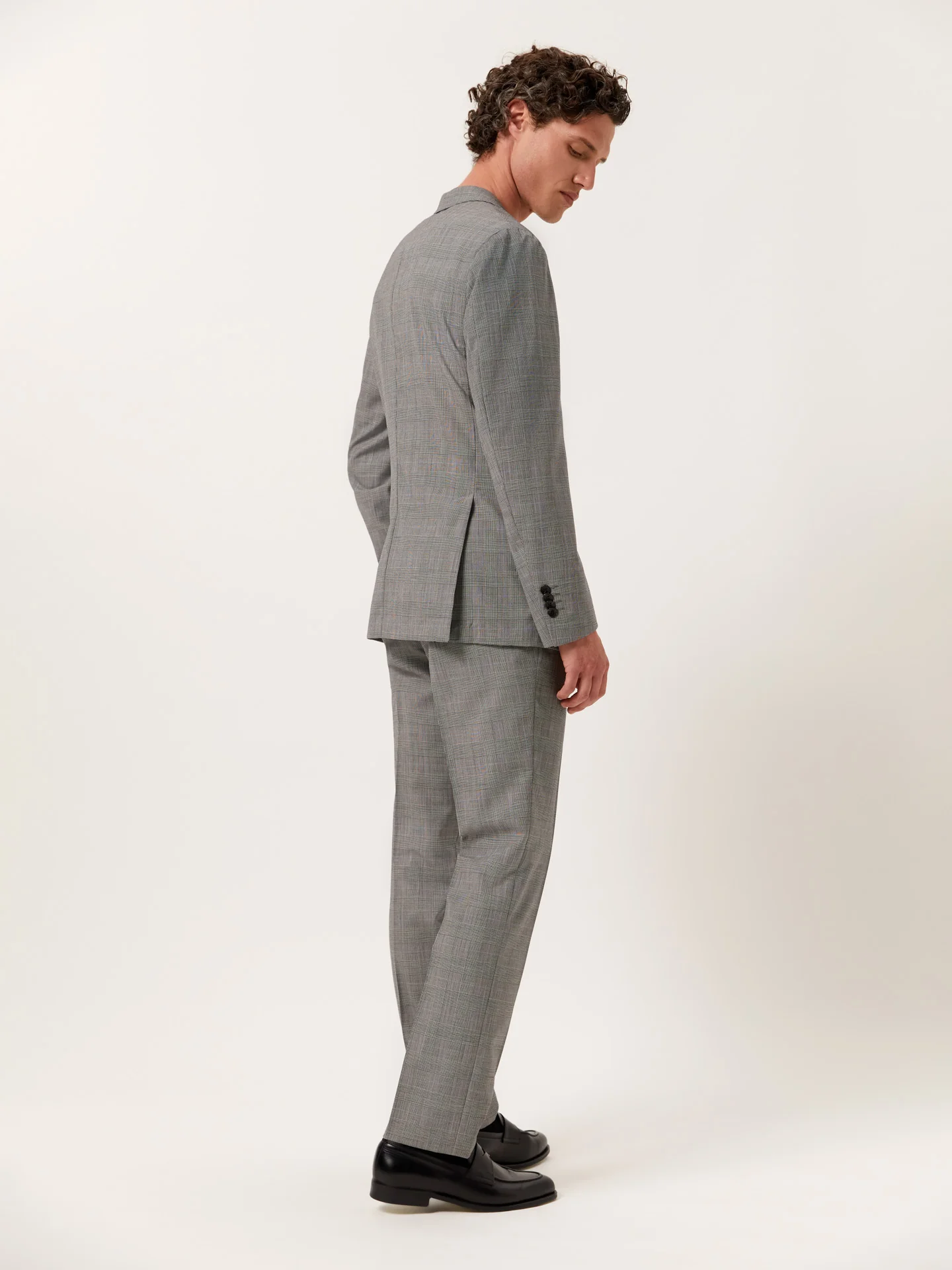 Habilmente confeccionado com tecido 100% lã num sofisticado padrão Príncipe de Gales, este fato de duas peças slim fit foi criado para quem prefere uma silhueta refinada e elegante. Equilibrando a elegância com a sofisticação moderna, o seu design elegante garante um aspeto sofisticado e polido. Totalmente sem forro, permite uma fácil sobreposição de peças e um movimento natural ao longo do dia. O blazer apresenta dois botões na frente, lapelas de entalhe e práticos bolsos de chapa, complementados com mangas de quatro botões e duas aberturas nas costas para facilitar o movimento. Os bolsos da frente e interiores foram cuidadosamente concebidos e oferecem um armazenamento funcional sem comprometer o seu estilo. As calças são impecavelmente confeccionadas, com braguilha com fecho de correr, cós alongado com botões, dois bolsos laterais com um discreto bolso para moedas, dois bolsos traseiros embutidos e passadores para o cinto para maior versatilidade. Todos os fatos têm medidas de regular fit do tamanho 56 ao 62.