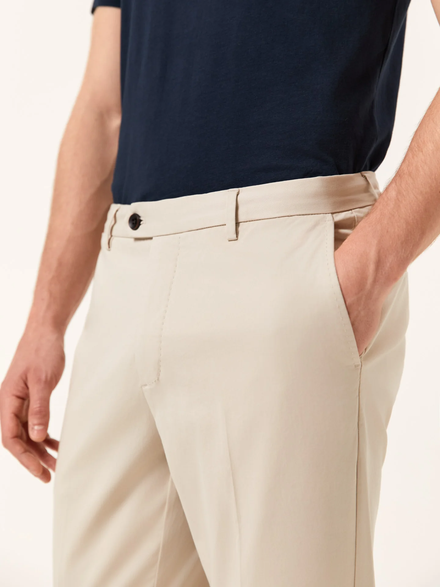 Uma peça distinta que conjuga elegância intemporal com versatilidade contemporânea. Confeccionadas em mistura de algodão e elastano, estas calças oferecem leveza, elasticidade e conforto durante todo o dia. Com corte slim, incluem fecho de correr com botão personalizado, presilhas para cinto, dois bolsos frontais oblíquos e dois bolsos traseiros. Uma etiqueta tecida com o logótipo da marca adorna o bolso traseiro. Finalizadas com bainha simples e costura única. Ideal para ambientes profissionais ou ocasiões em que a apresentação é essencial. Uma escolha sofisticada que eleva qualquer guarda-roupa.